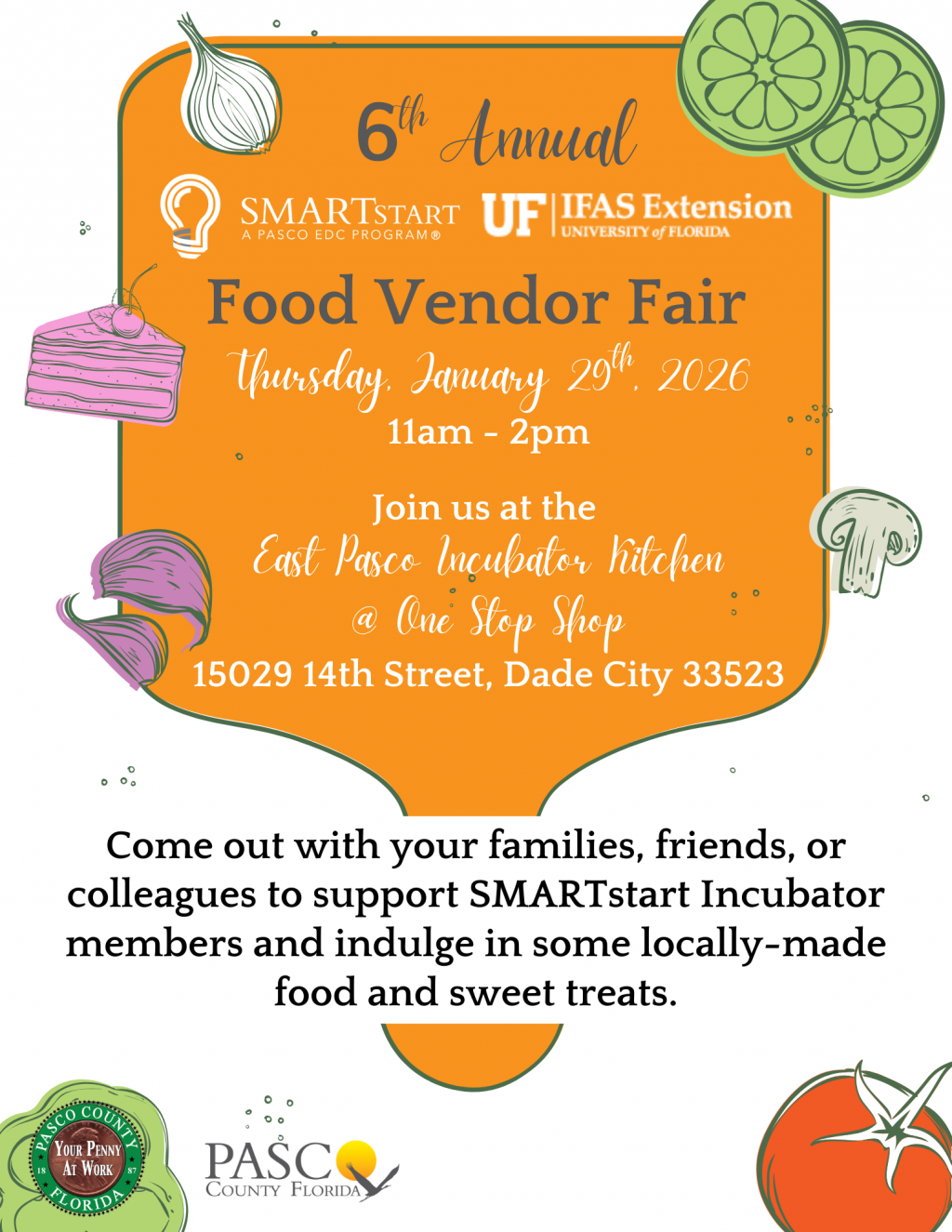 Join UF/IFAS Pasco County Extension and Pasco EDC SMARTstart for our vendor fair at the Extension’s One Stop Shop (15029 14th St.) in Dade City. This family-friendly, food event aims to share incubator business opportunities and support our current food entrepreneurs' businesses.